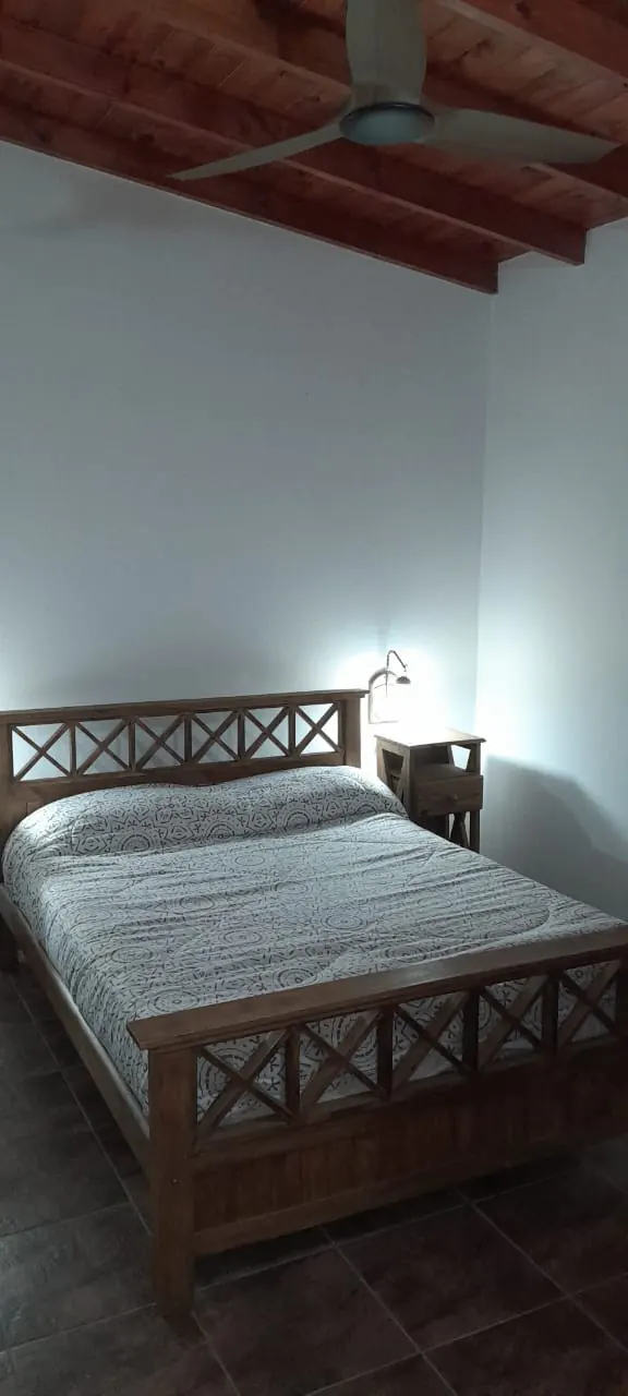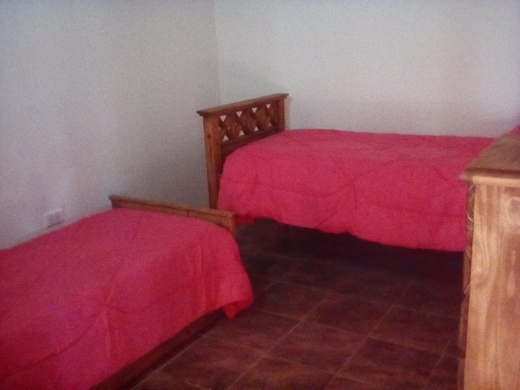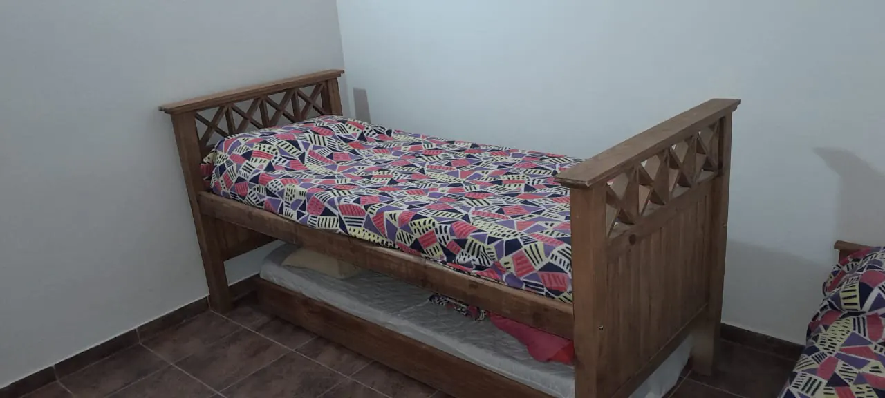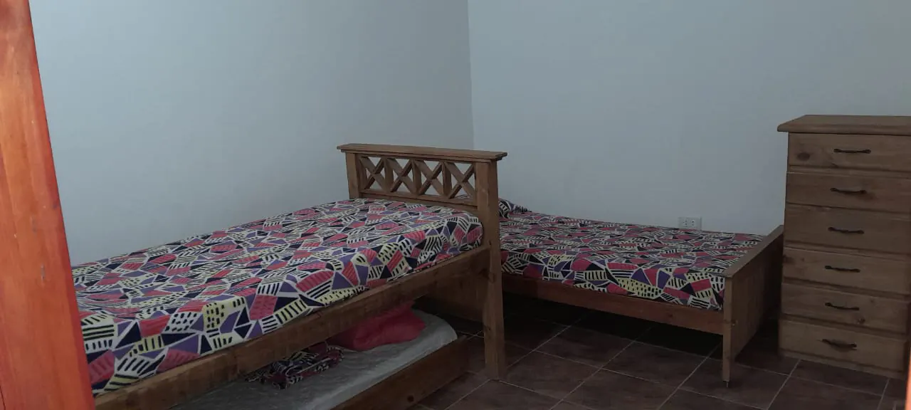 Cabaña de 3 ambientes en planta baja con 1 dormitorio matrimonial y otro dormitorio con 2 camas de 1 plaza más 1 cama carrito.
