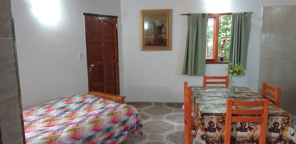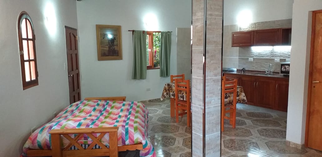 Monoambiente amplio con cama matrimonial y cama de plaza.